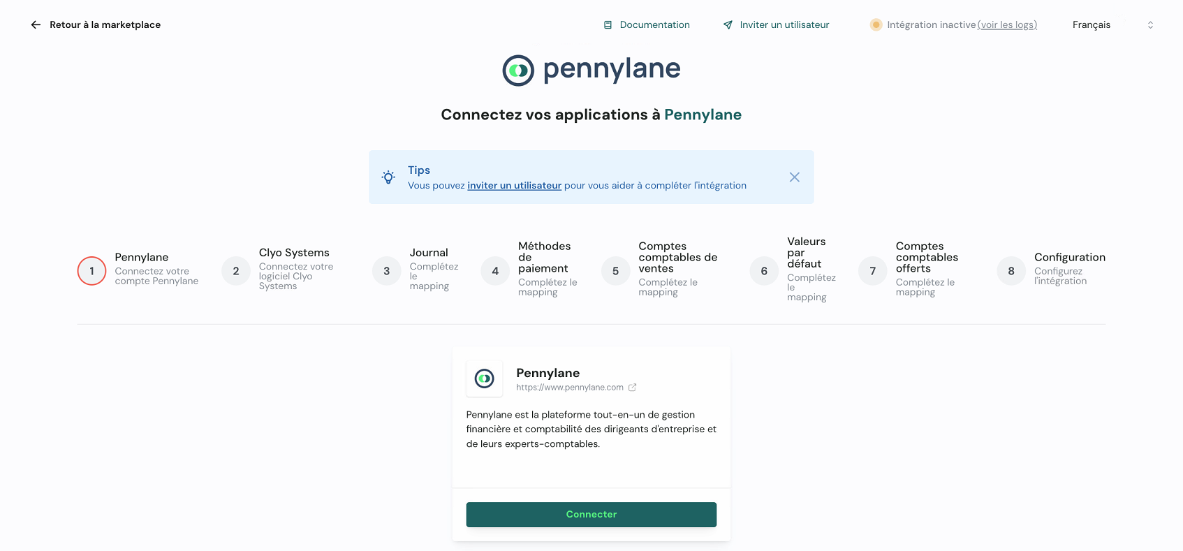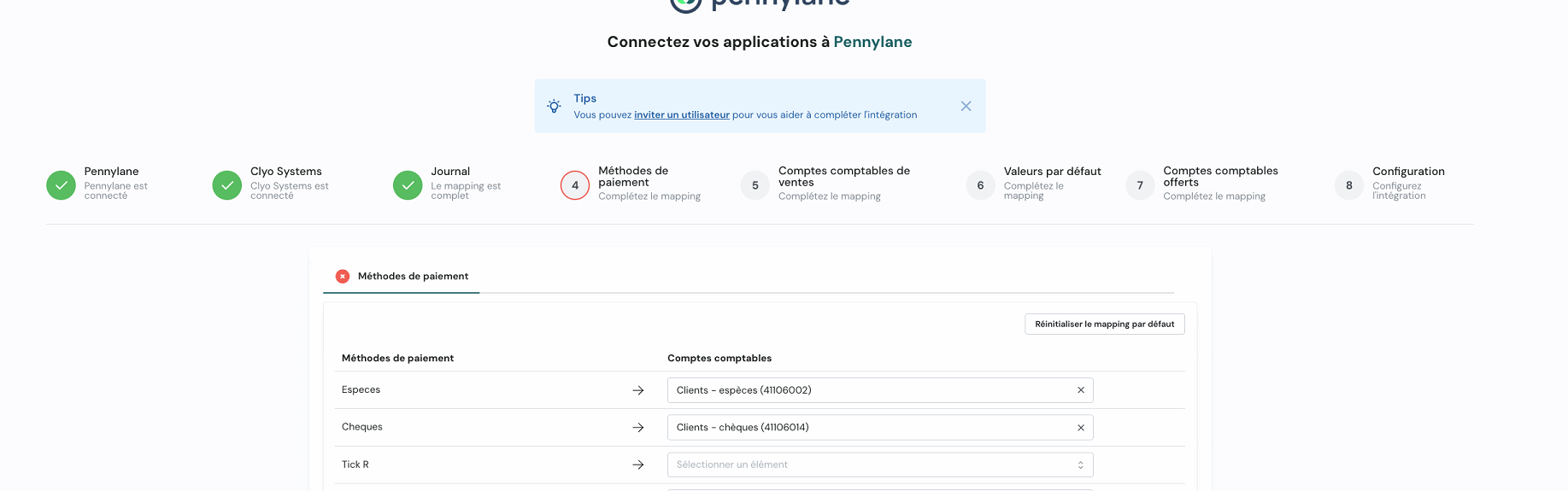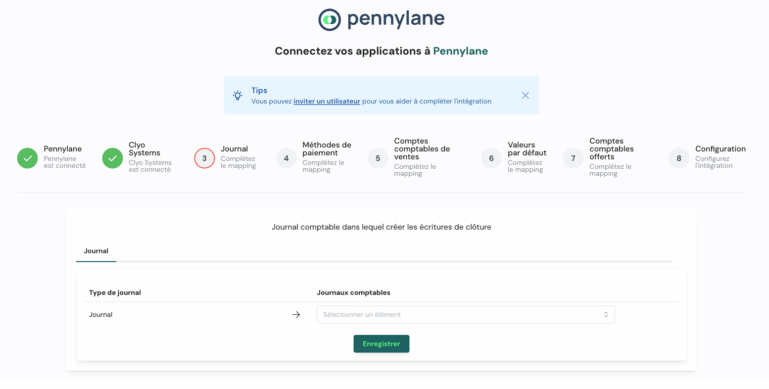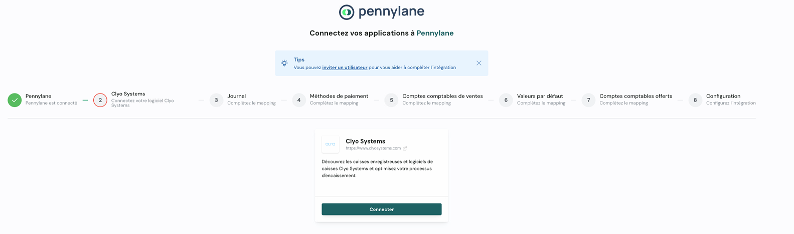 Une fois les connexions Pennylane ✅ et Clyo Systems ✅ validées, complétez les étapes de mapping :