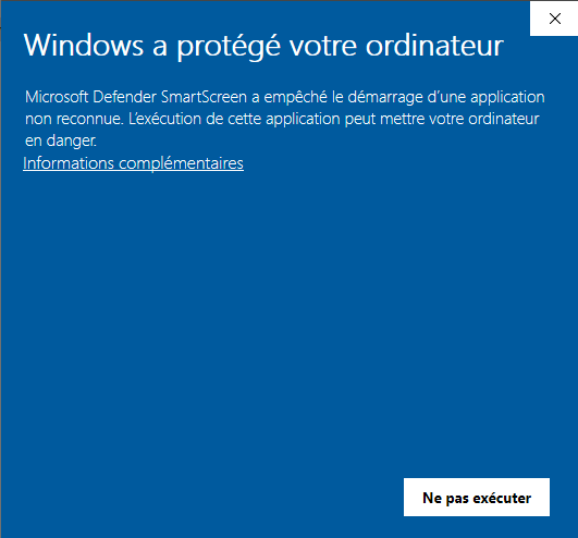 - Solution : cliquez sur Informations complémentaires dans la fenêtre bleue, puis sur Exécuter quand même.