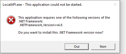 Si une erreur « .NET Framework 4.8 requis » s'affiche, cliquez sur Oui pour l'installer, ou téléchargez-le manuellement ici. Relancez ensuite l'installation.