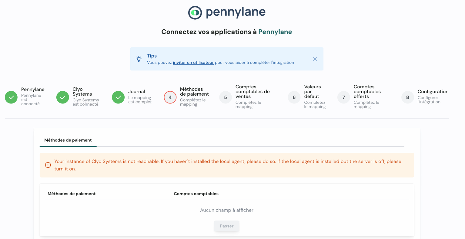 | 4 | Méthodes de paiement | Associez chaque méthode de paiement Clyo à un compte comptable Pennylane. Si l'agent est injoignable, vérifiez qu'il est bien en cours d'exécution. |