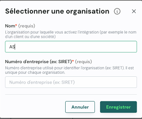 - Nouvelle organisation : cliquez sur « En créer une nouvelle », renseignez le nom de l'entreprise et le numéro SIRET, puis cliquez sur Enregistrer