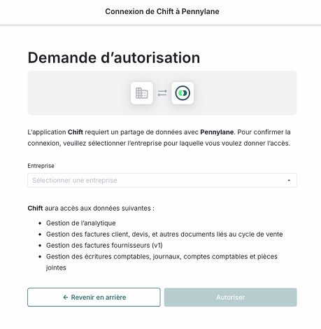 - Sélectionnez l'entreprise Pennylane concernée dans la liste Entreprise
