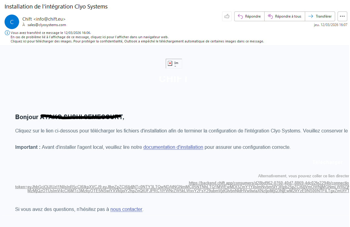 - Cause : l'agent local CHIFT n'est pas en cours d'exécution sur le serveur Clyo Systems.