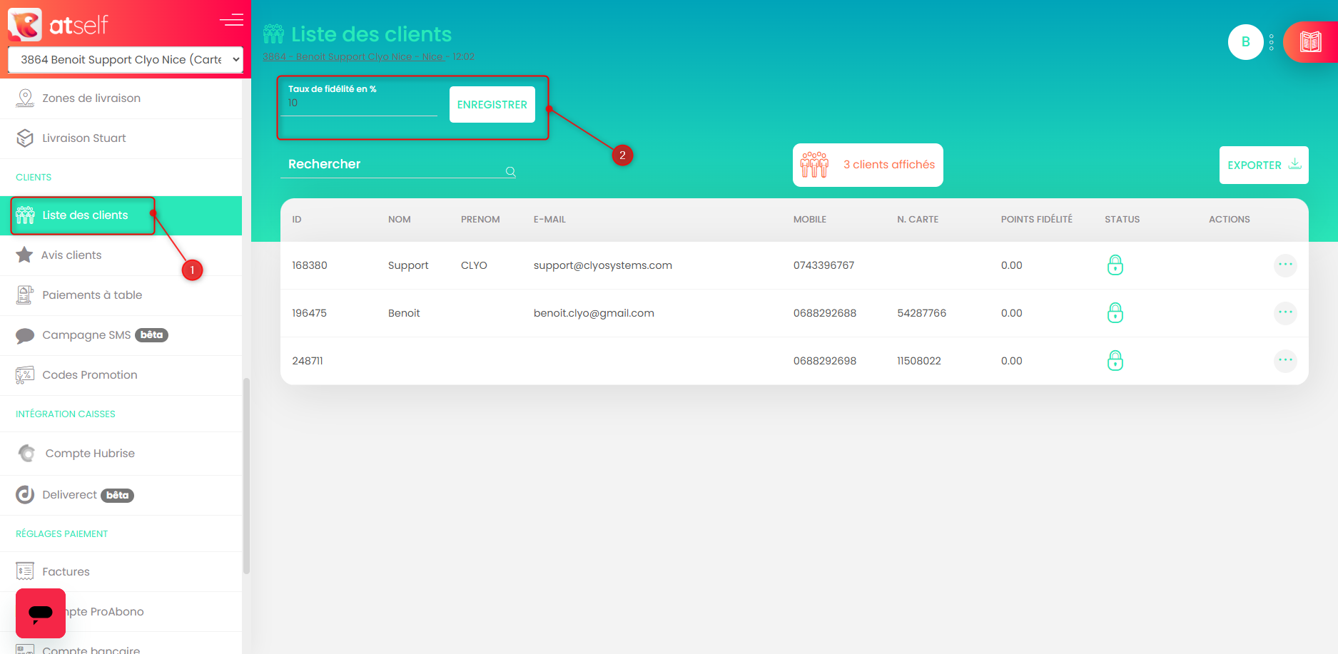 En haut de la page, renseignez le Taux de fidélité en % (2) puis cliquez sur Enregistrer