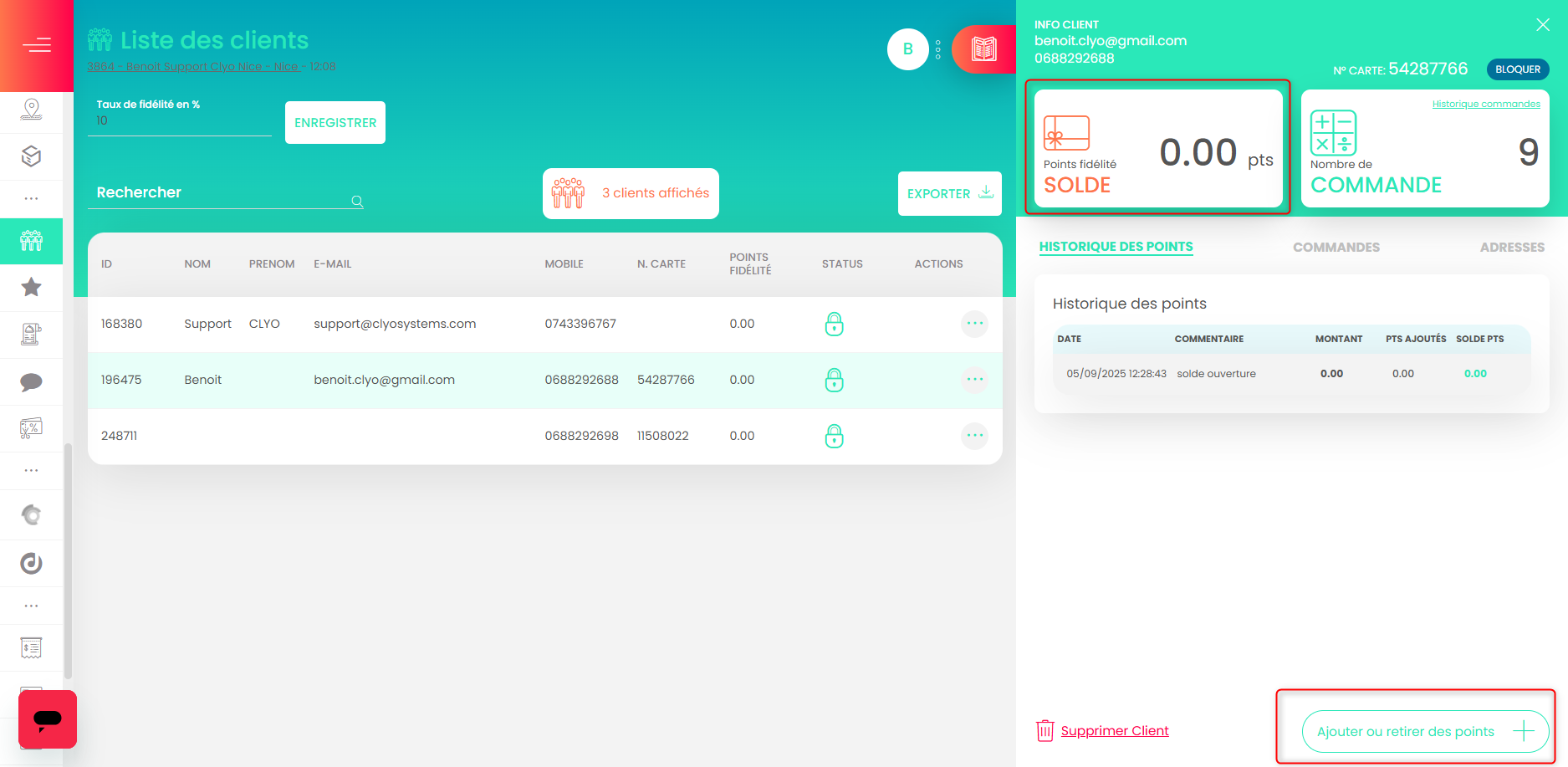 Depuis Liste des clients, vous pouvez gérer les comptes fidélité et les points de vos clients (création de carte, consultation, ajustement des points).
