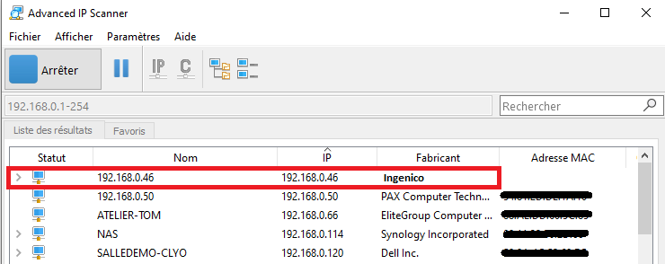 Ouvrir Advanced IP scanner et lancer la recherche, repérer le TPE Ingenico comme ci-dessous.