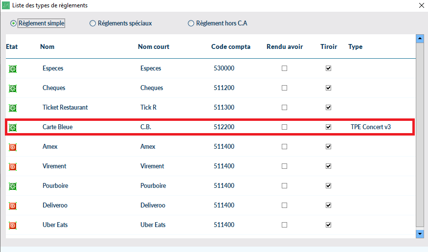 Se rendre ensuite dans Paramètres > Gestion des règlements. Trouver la ligne Carte Bleue et y associer TPE Concert v3