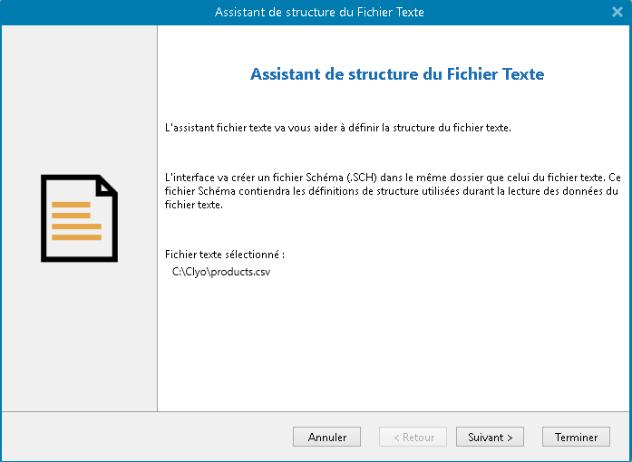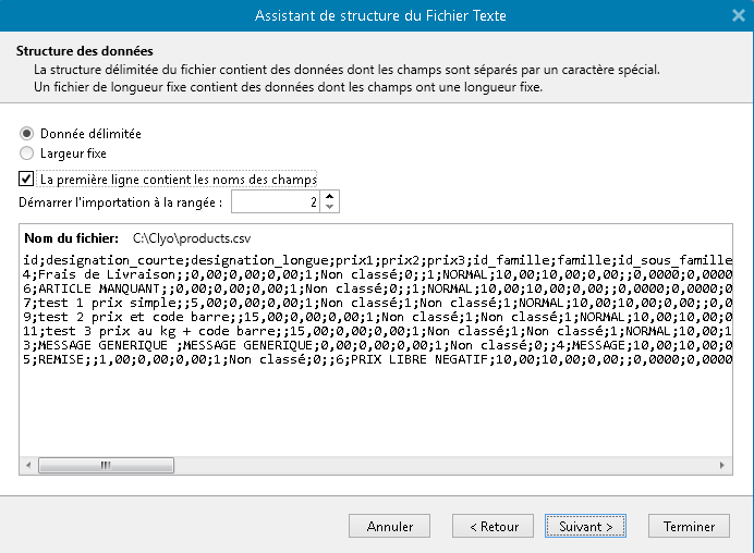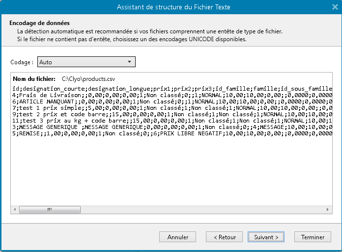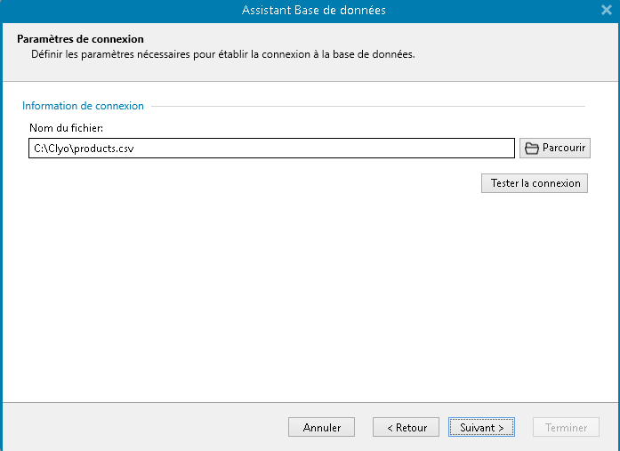 Cliquer sur suivant et Parcourir. Trouver le fichier ExportProducts.csv dans le répertoire Clyo ( C:\Clyo)