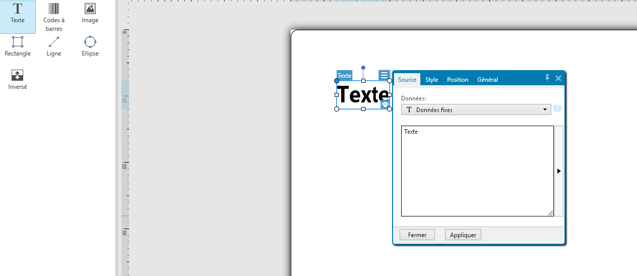 Pour ajouter un code barre, selectionner code barre et l'ajouter à l'étiquette. Parametrer ensuite celui-ci comme sur l'image qui suit puis appliquer.