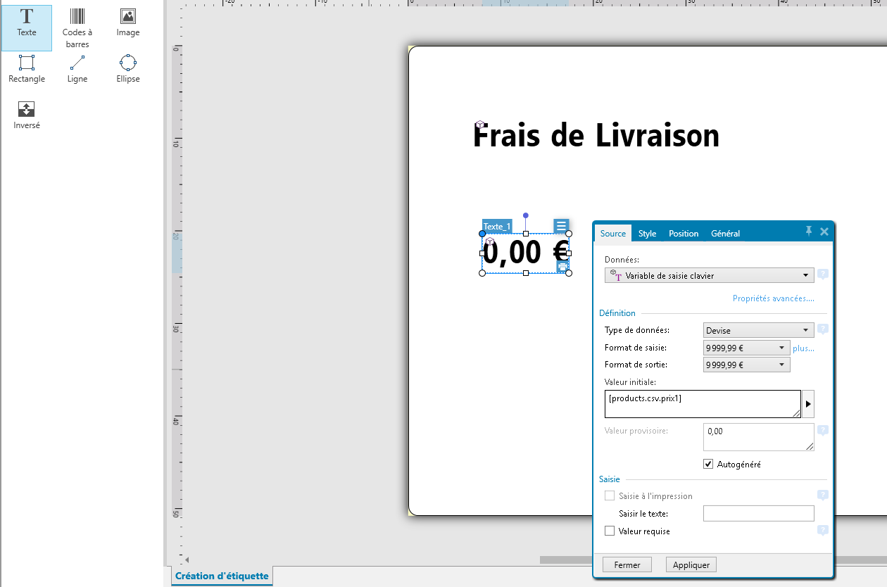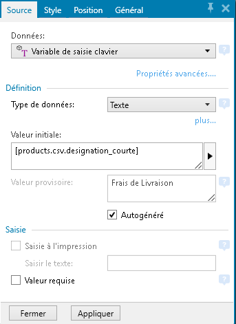 Dans ses paramètres, le configurer en Variable de saisie clavier et, dans le champs Valeur initiale, selectionner [product.csv.designation_courte] à l'aide de la flèche sur la droite.