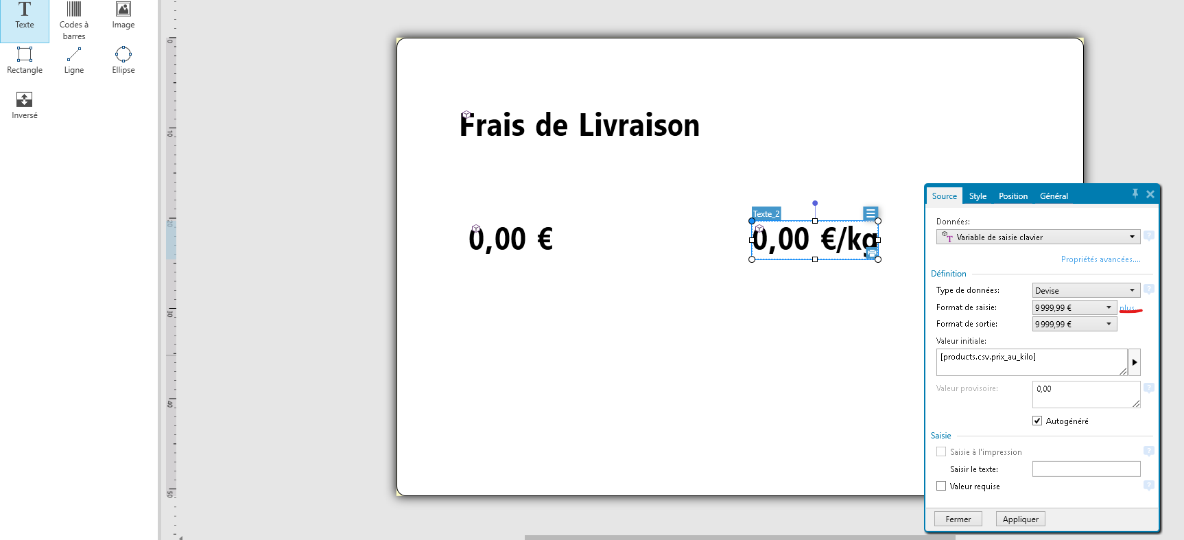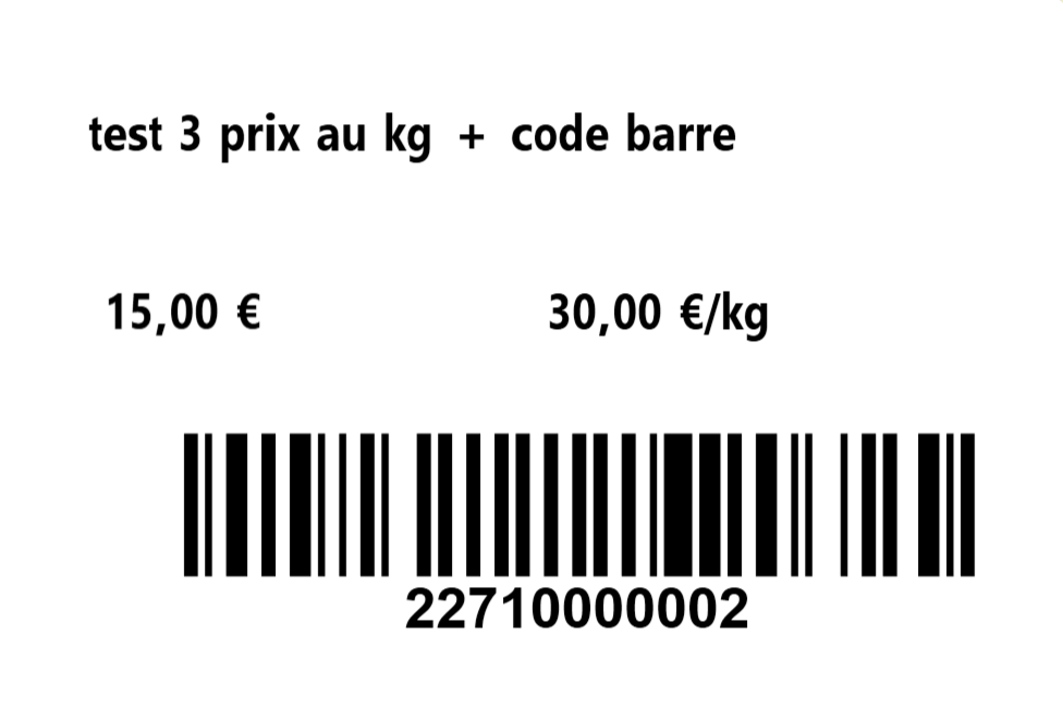 Enfin, pour les étiquettes nécessitant un prix au kg, ajouter une nouvelle zone de texte et la paramètrer de cette manière.