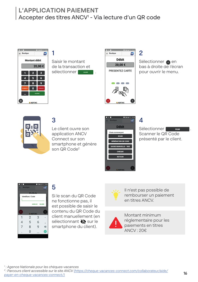 Le montant minimum réglementaire en titres ANCV est de 20 €, et il n’est pas possible de rembourser un paiement réalisé en titres ANCV.