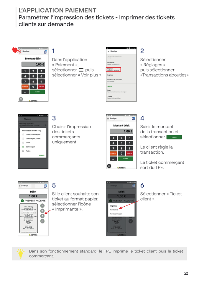 Par défaut, le terminal imprime d’abord le ticket client, puis le ticket commerçant. Vous pouvez modifier ce comportement pour n’imprimer le ticket client qu’en cas de demande.