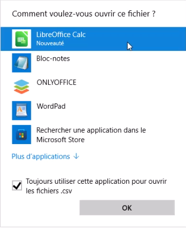 Le logiciel de traitement de texte s'ouvre alors sur votre poste. Il est possible qu'une fenêtre s'ouvre alors, vous demandant avec quel logiciel le document généré doit être ouvert, il faut dans ce cas sélectionner le tableau de votre outil d'édition. "LibreOffice Calc" (logiciel préinstallé sur votre caisse Clyo) puis valider: